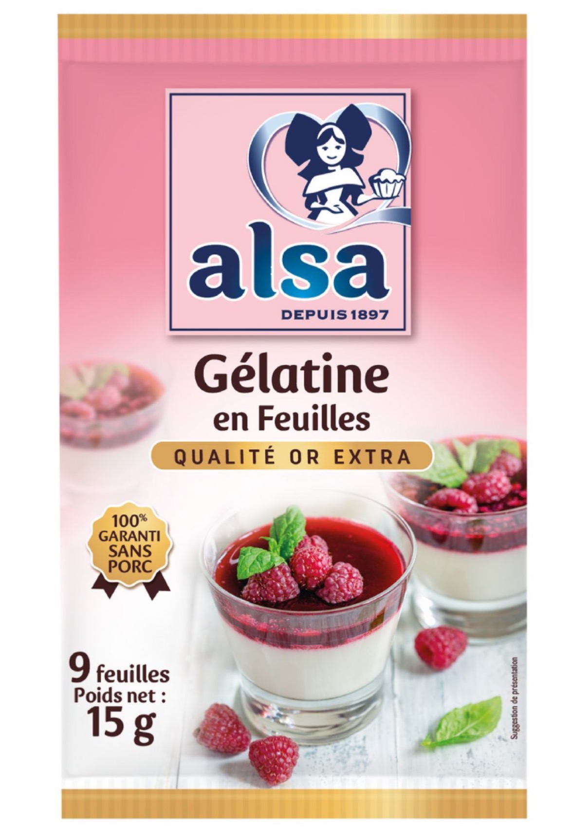 Découvrez la gélatine en feuilles Alsa ! Avec sa qualité Or Extra, une qualité qui permet un fort pouvoir gélifiant, réalisez toutes vos préparations préférées : panna cotta, flan, terrine...