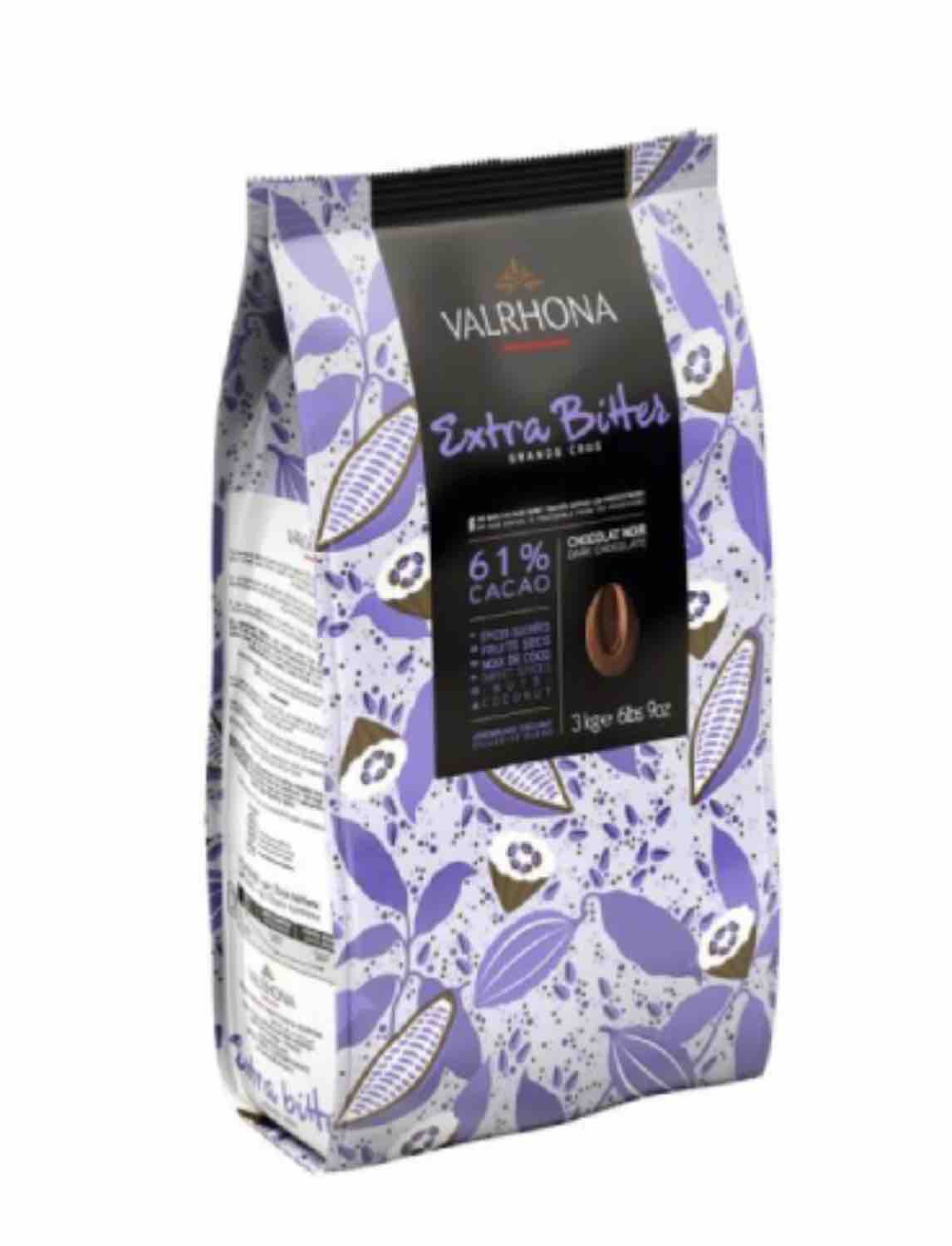 Valrhon Fève de Chocolat de Couverture Noir 61% Extra Bitter 3kg/Sachet